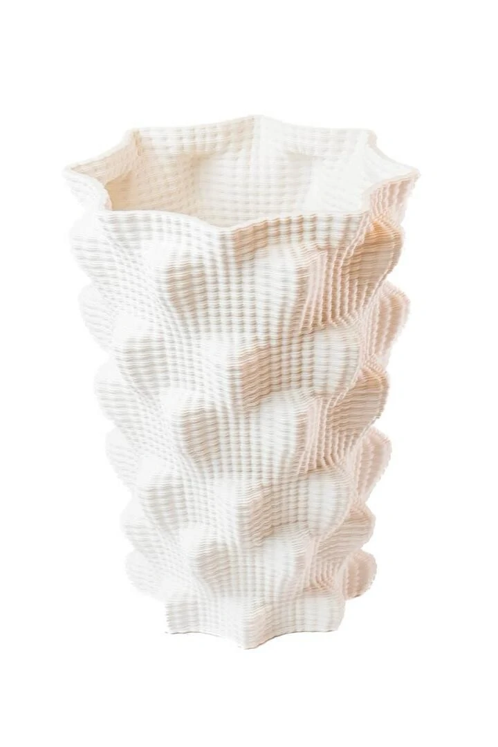Este vaso decorativo em cerâmica branca se destaca pelo seu design inovador em 3D, que proporciona textura e profundidade à peça. Moderno e sofisticado, ele é ideal para quem busca um elemento de destaque com personalidade única na decoração.