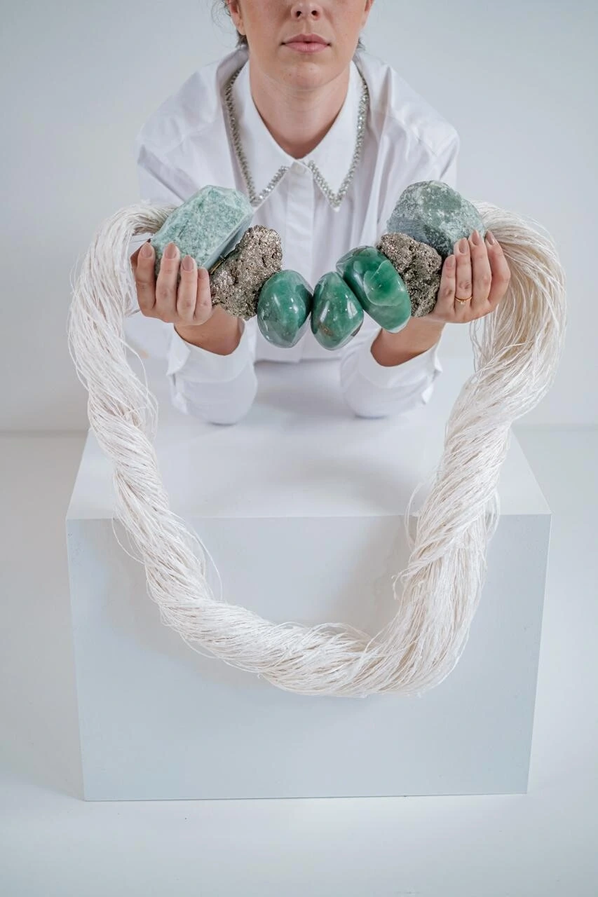 Este colar de mesa decorativo é uma peça artesanal exclusiva da marca Ângela Maria, que combina a energia do quartzo verde com a força e o brilho da pirita. Produzido de forma manual e cuidadosa, cada colar é único, com pedras naturais dispostas em um fio de seda rústica que valoriza a estética orgânica, elegante e atemporal.