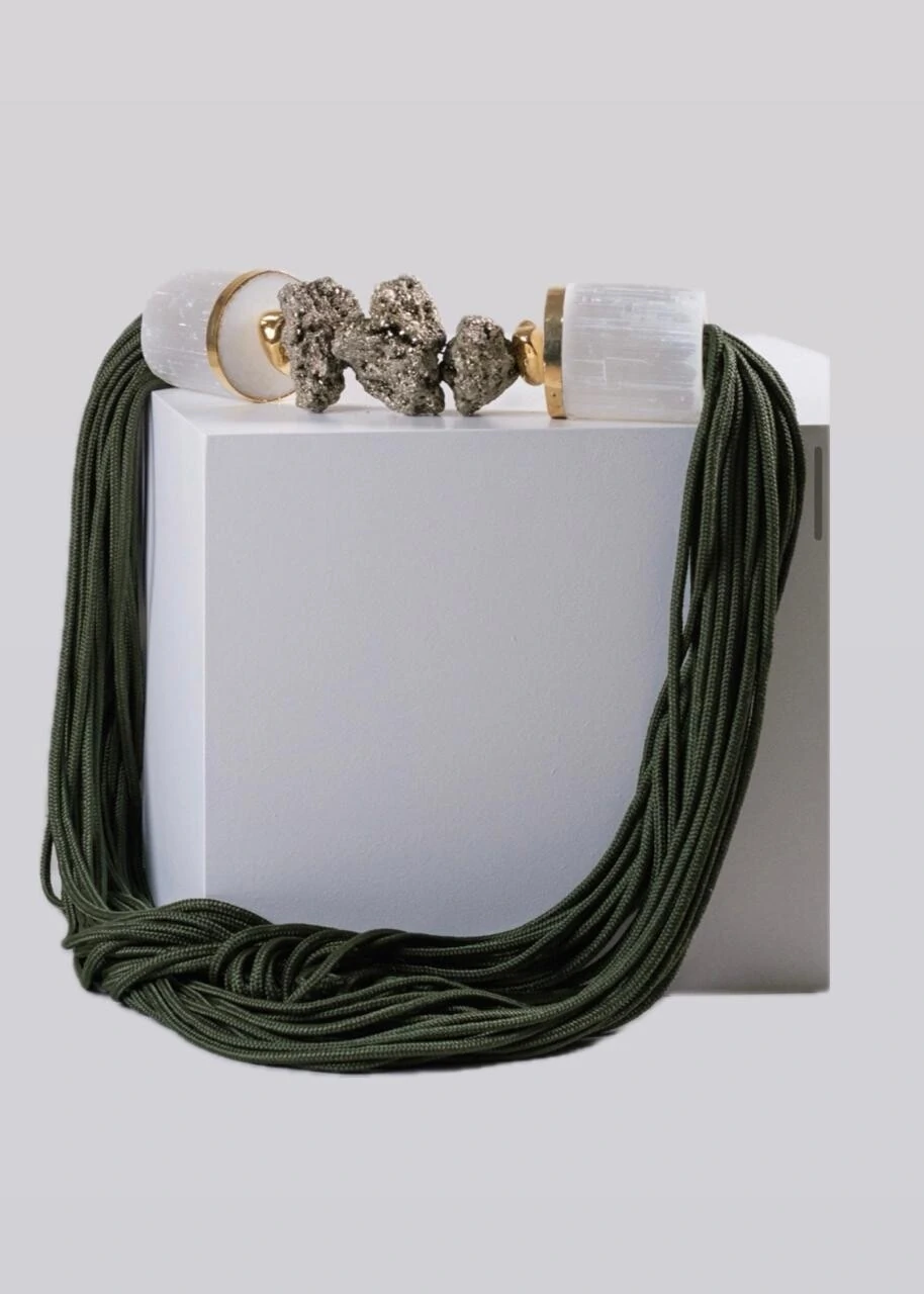 Este colar decorativo de mesa da marca Ângela Maria é uma peça artesanal que combina a pureza da selenita com a força e o brilho da pirita. Além dessas pedras naturais, o colar possui detalhes com pedras banhadas na cor ouro, conferindo sofisticação e elegância. Montado em corda náutica verde, proporciona um visual contemporâneo e marcante, ideal para composições decorativas cheias de personalidade.