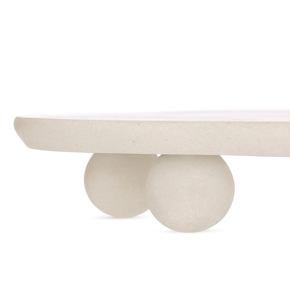Bandeja em polirresina, sem alças, na cor branca. O tampo da bandeja é reto e plano, sustentado por quatro pés formados por esferas, conferindo um design moderno e minimalista.