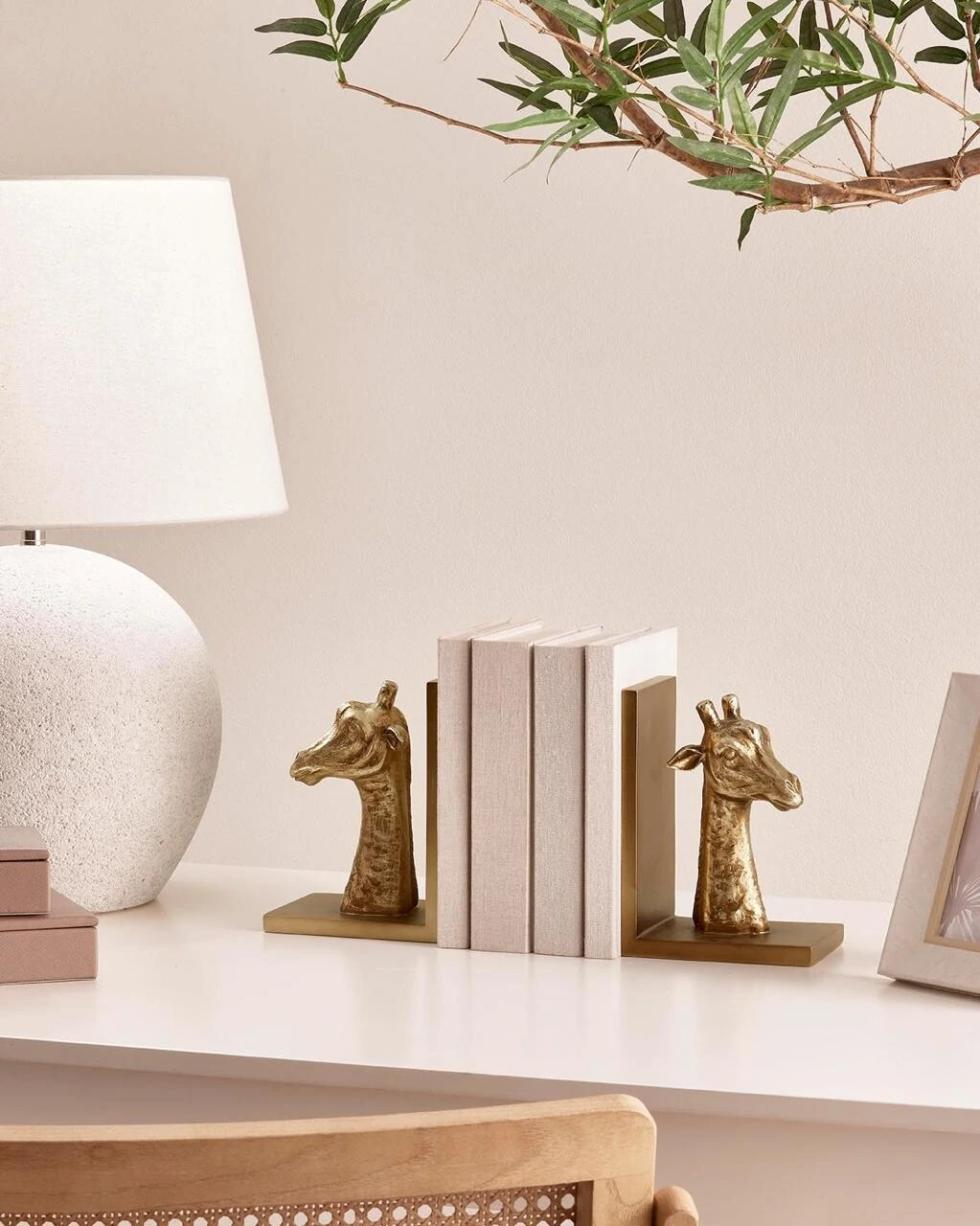 O Aparador de Livros Girafinhas Dourado é uma peça encantadora que une funcionalidade e charme. Com design delicado em formato de girafas e acabamento dourado, ele organiza seus livros com estilo e adiciona um toque lúdico e elegante à decoração. Ideal para quem deseja valorizar os detalhes e trazer leveza ao ambiente.
