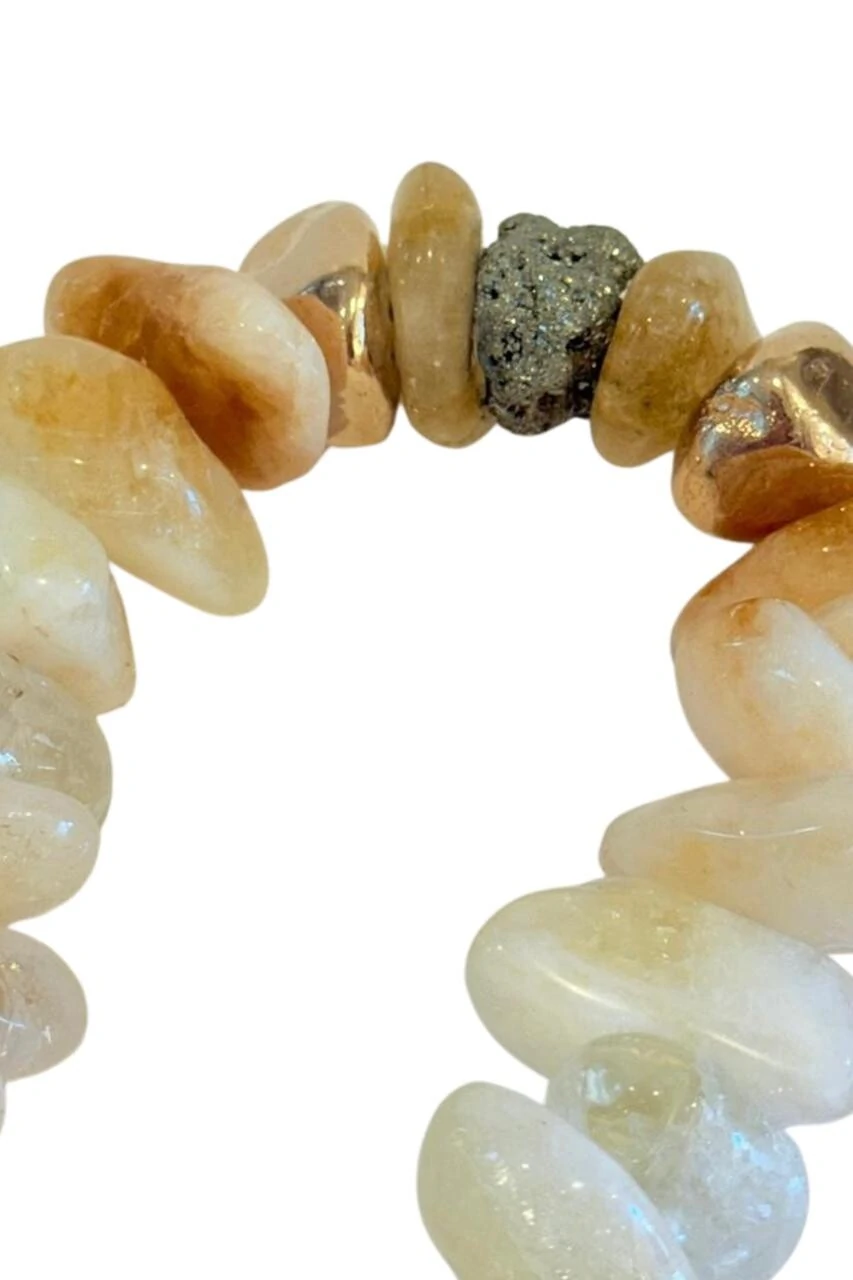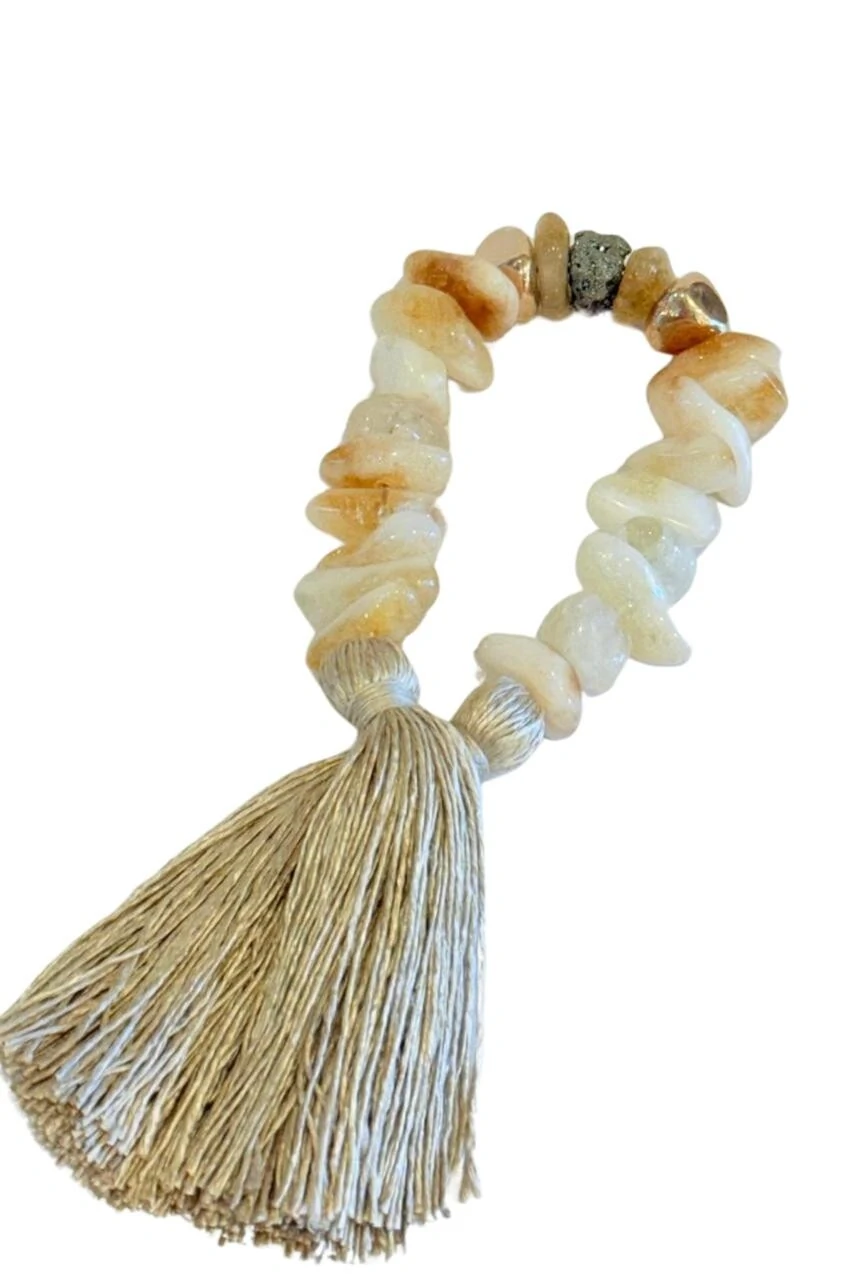 Material: Pedras naturais (citrino, pirita, pedras com acabamento dourado) e tassel de seda