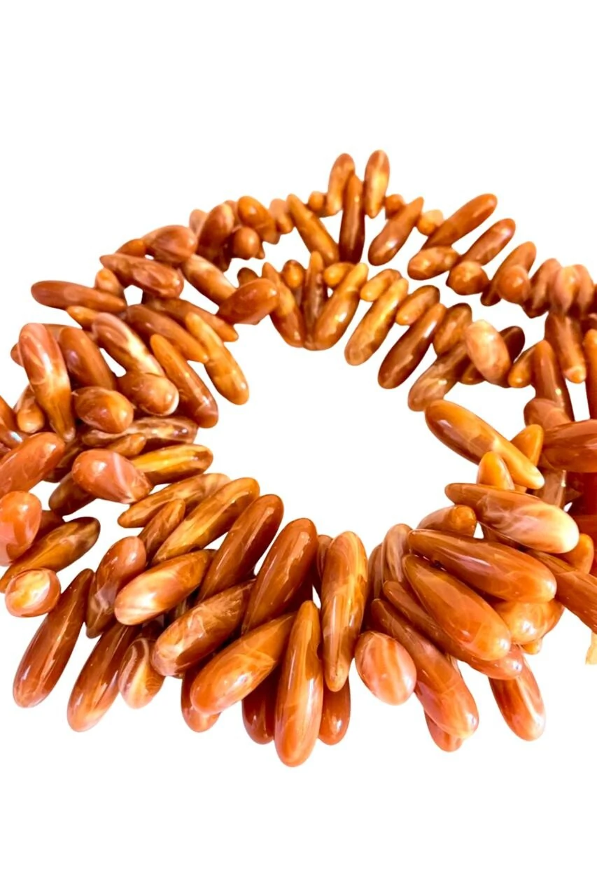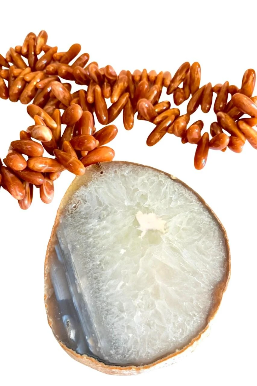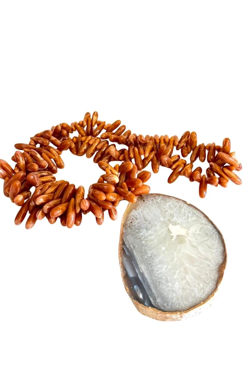 O Colar Decorativo em Resina Terracota com Chapa de Ágata é uma peça de presença marcante e visual elegante. Seu corpo é formado por bastonetes de resina em tom terracota — uma cor terrosa e acolhedora, que remete à natureza e ao calor dos elementos orgânicos. A peça é finalizada com uma bela chapa de ágata, que traz um toque de brilho e textura natural à composição.
