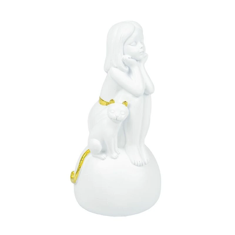 A Escultura Decorativa Menina com Gatinho é uma peça cheia de ternura e delicadeza. Produzida em resina branca com detalhes em dourado, ela retrata uma menina com cinto dourado em seu vestido, acompanhada de um gatinho com orelhinhas e rabinho também dourados. Ambos estão posicionados sobre uma base arredondada, o que confere equilíbrio e charme à composição.