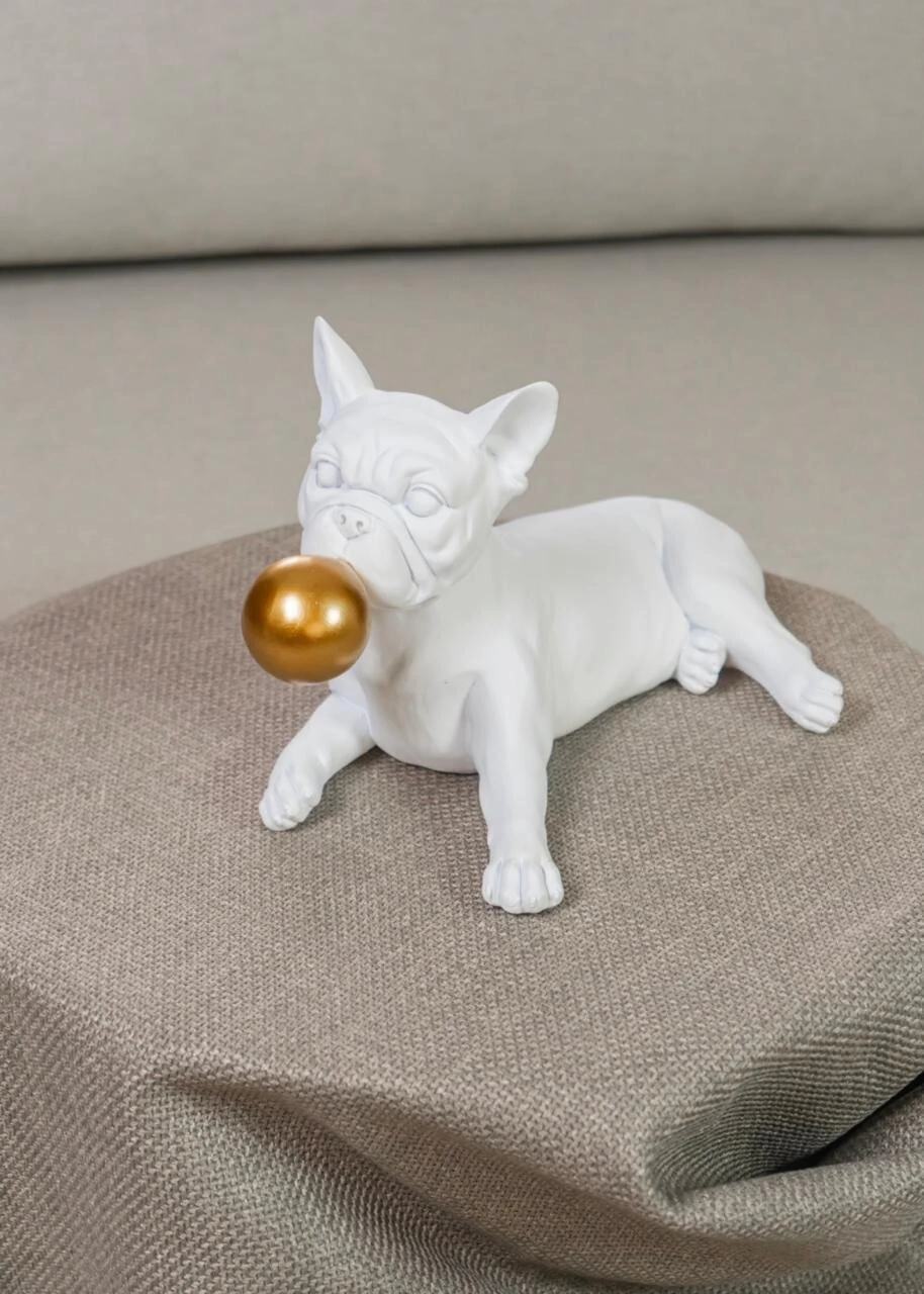 Divertida e cheia de personalidade, a Escultura Decorativa Bulldog com Balão é daquelas peças que roubam a cena. Produzida em polirresina branca com detalhes dourados, a escultura retrata um simpático bulldog com um balão dourado na boca — um toque inusitado e encantador para composições criativas e descontraídas.