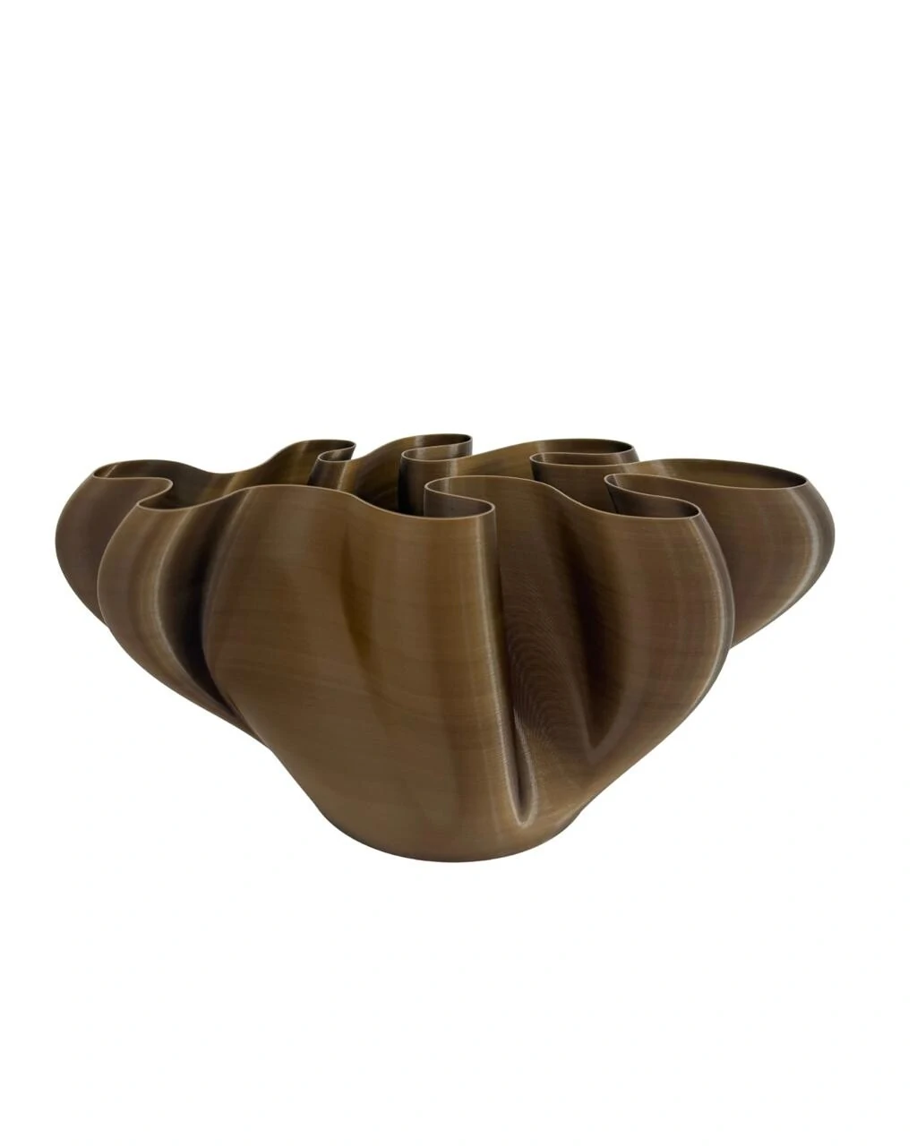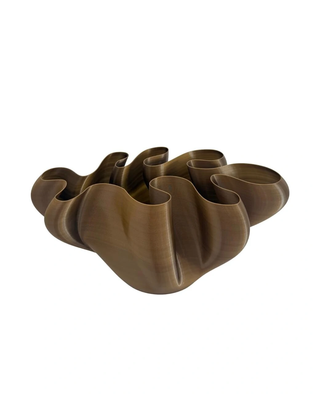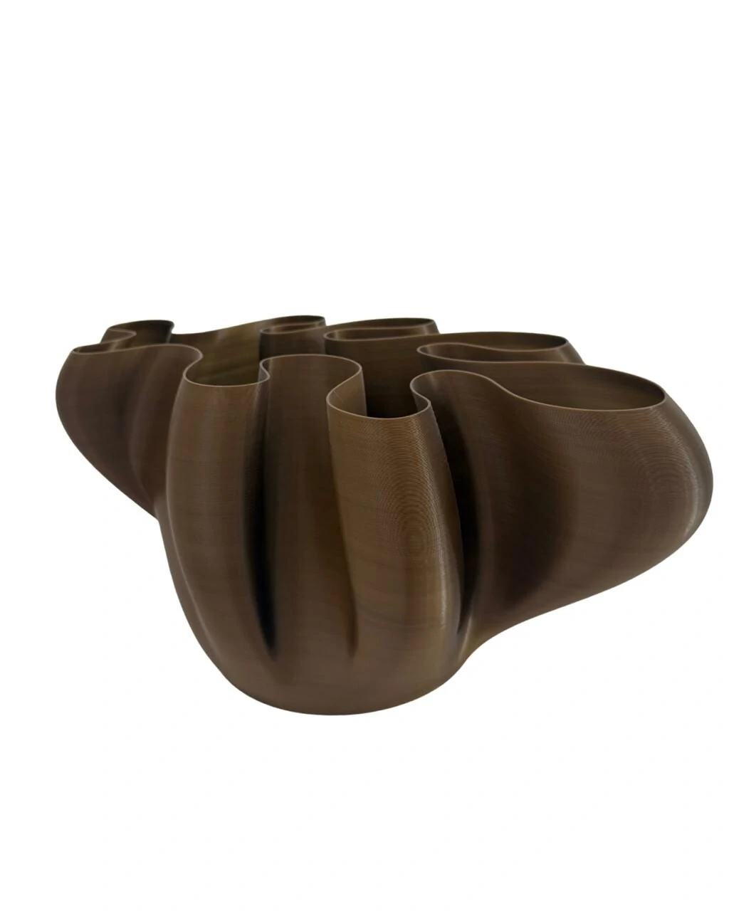 Assinado pela designer Anna Machado, o vaso Corais de Matice é produzido em impressão 3D com polímero PLA e apresenta formas orgânicas inspiradas na delicadeza e fluidez dos corais marinhos. Com acabamento fosco na cor ouro velho, essa peça une leveza visual e sofisticação, sendo perfeita para compor ambientes contemporâneos com originalidade.