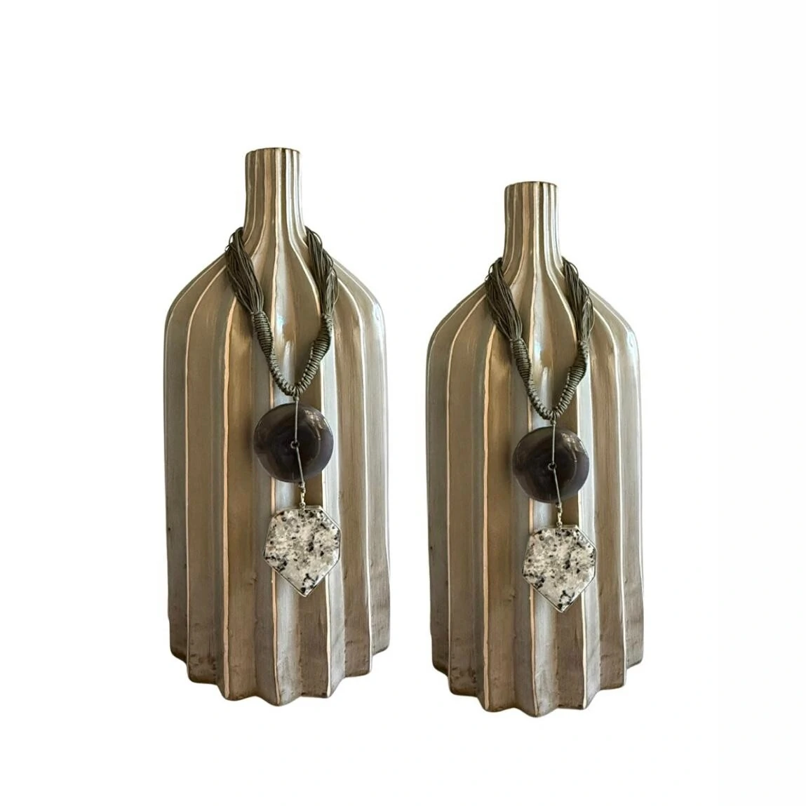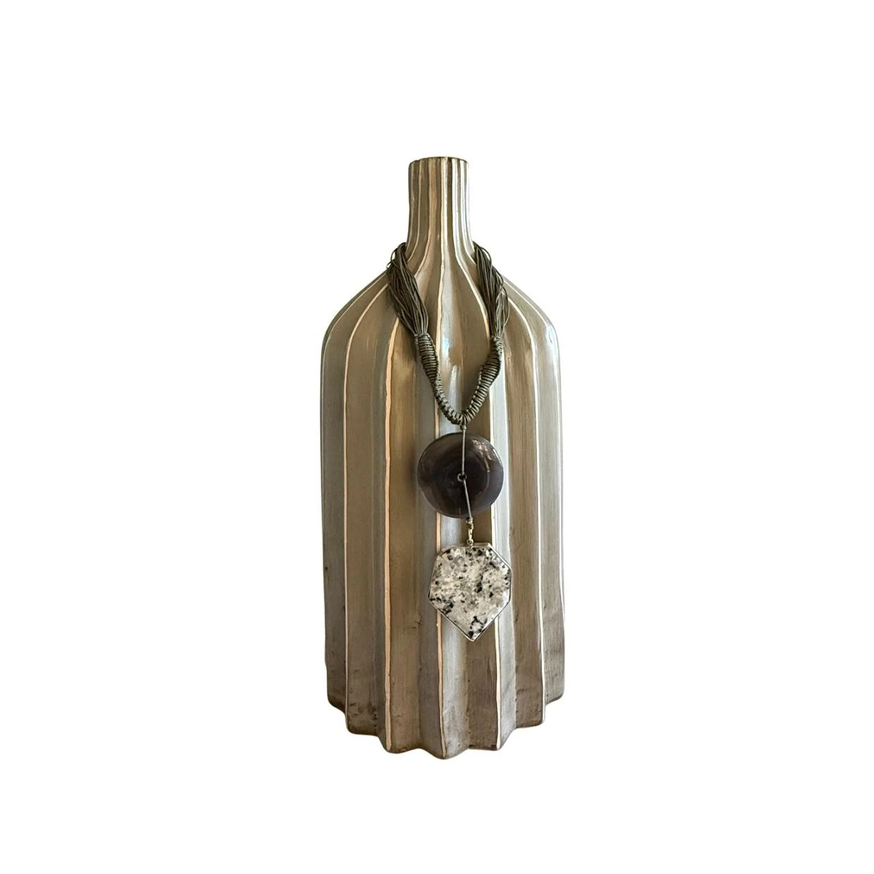 Vaso Decorativo em Cerâmica Cinza com Colar Artesanal em Pedra Natural