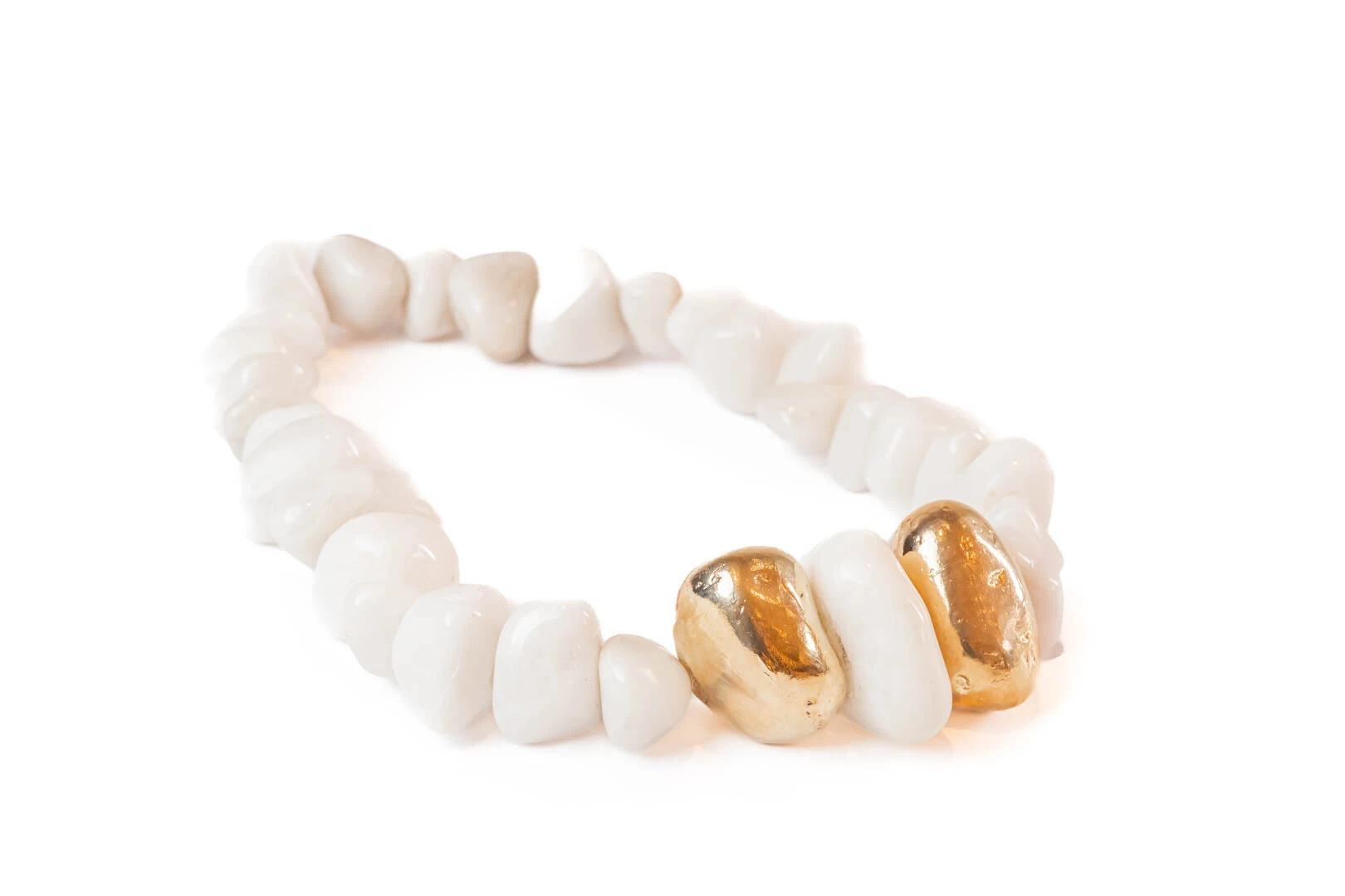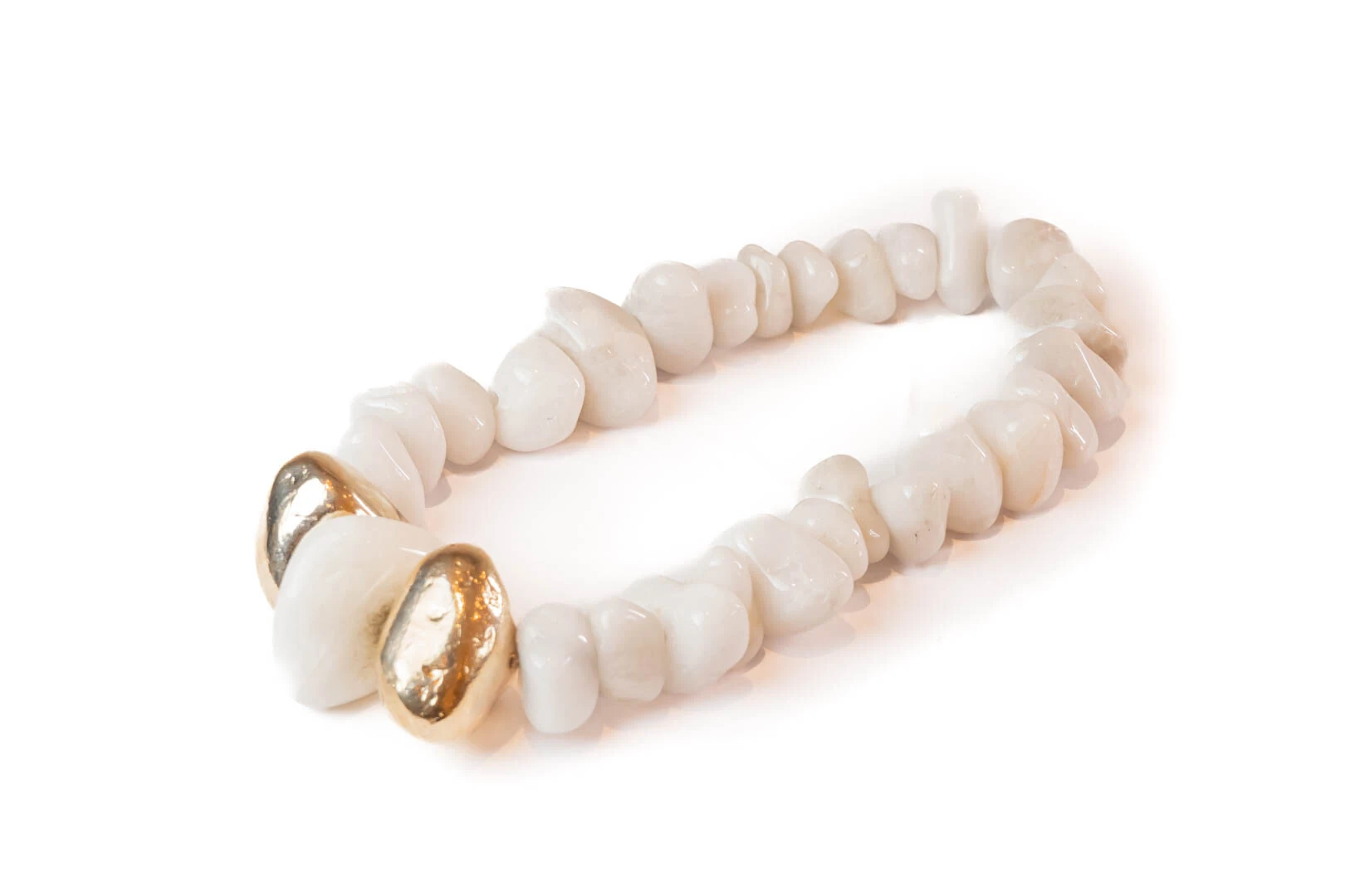 Colar de mesa decorativo em quartzo branco, com acabamento em pedras banhadas em dourado. Uma peça cheia de textura, brilho sutil e presença marcante, que une elementos naturais e acabamento sofisticado para composições elegantes e contemporâneas.