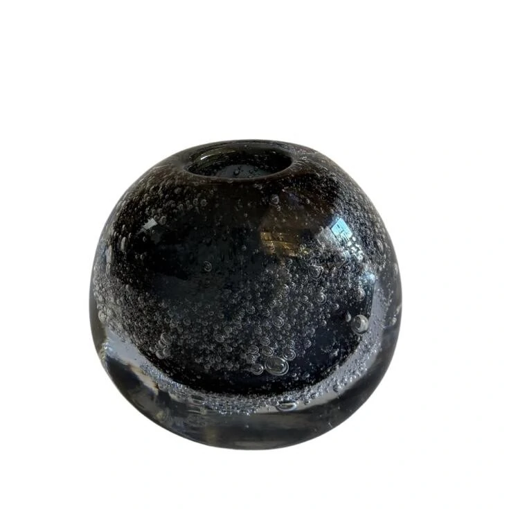 Este elegante vaso decorativo em vidro estilo Murano traz sofisticação e charme à sua decoração. Com formato arredondado, ele apresenta uma camada externa de vidro transparente que revela, entre ela e o vidro preto interno, delicadas bolhinhas distribuídas por todo o corpo. Uma peça marcante, que pode ser usada com ou sem flores, como um objeto escultural.