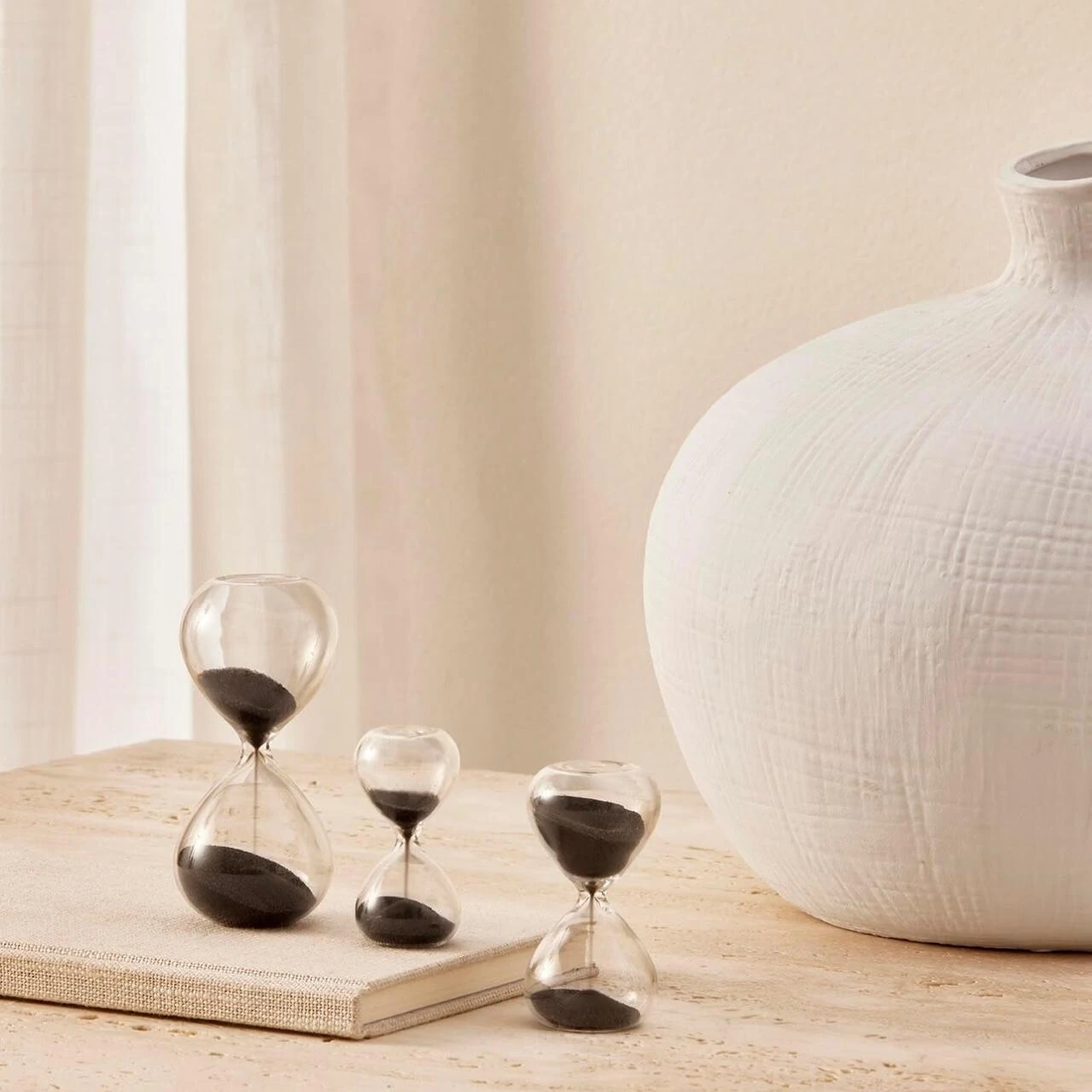 Trio de mini-ampulhetas decorativas em vidro transparente, com areia na cor preta. Uma composição charmosa e minimalista que traz um toque de estilo e curiosidade para a decoração. Perfeitas para serem usadas juntas ou separadas, acrescentando um detalhe diferenciado ao ambiente.
