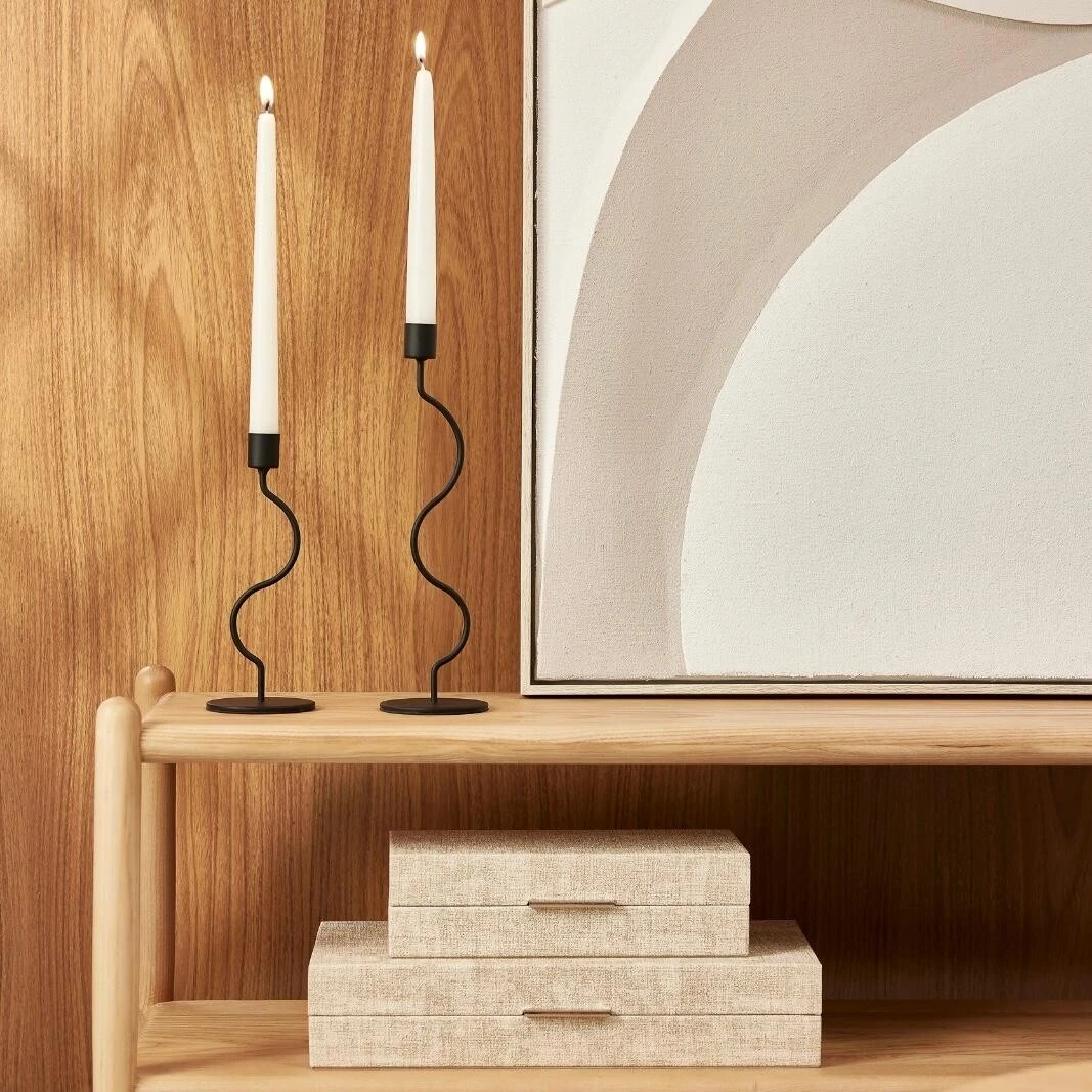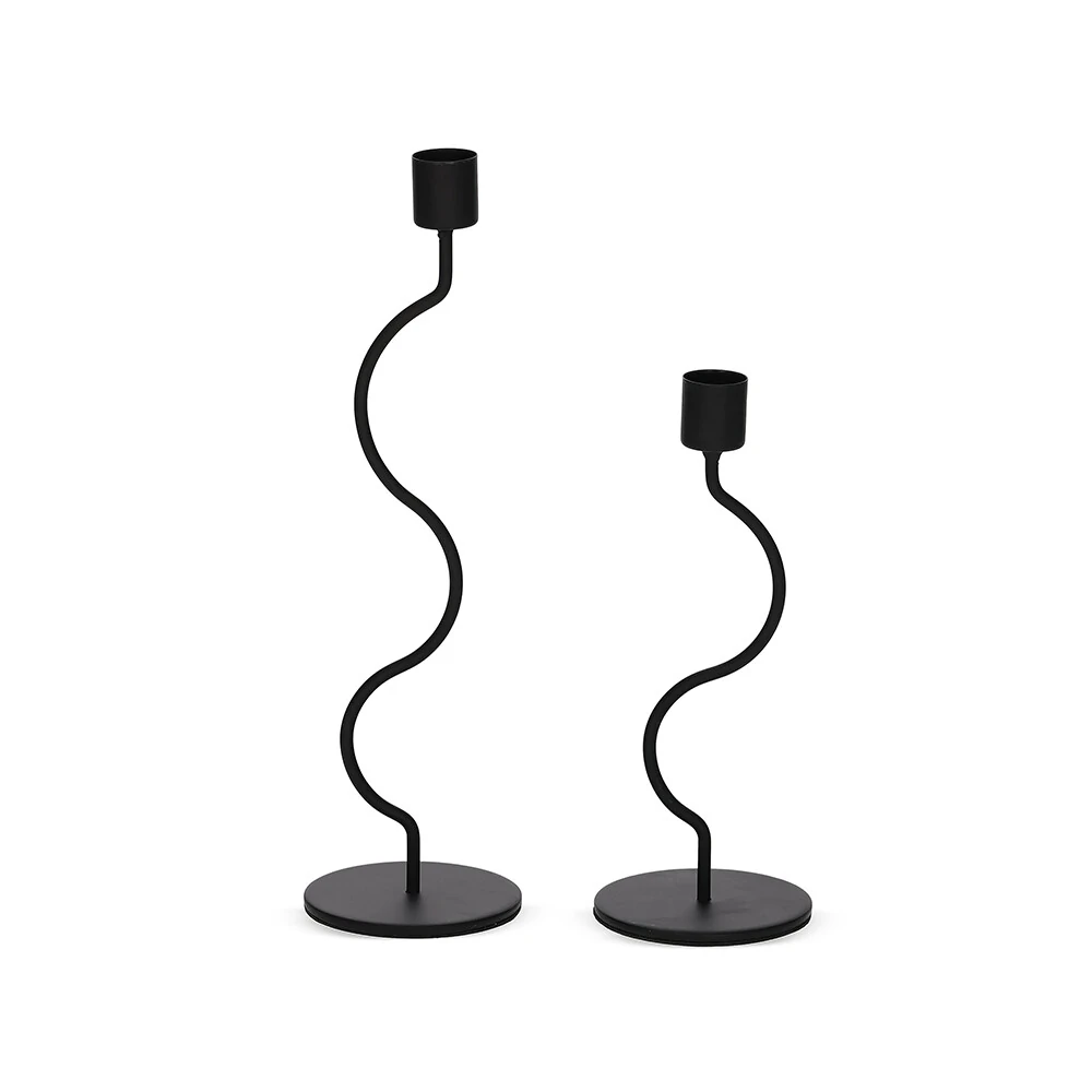 Kit de castiçais decorativos em metal preto, com formato alongado e corpo ondulado, que traz movimento e personalidade à peça. Uma escolha moderna e elegante para composições com velas, seja na decoração diária ou em ocasiões especiais.