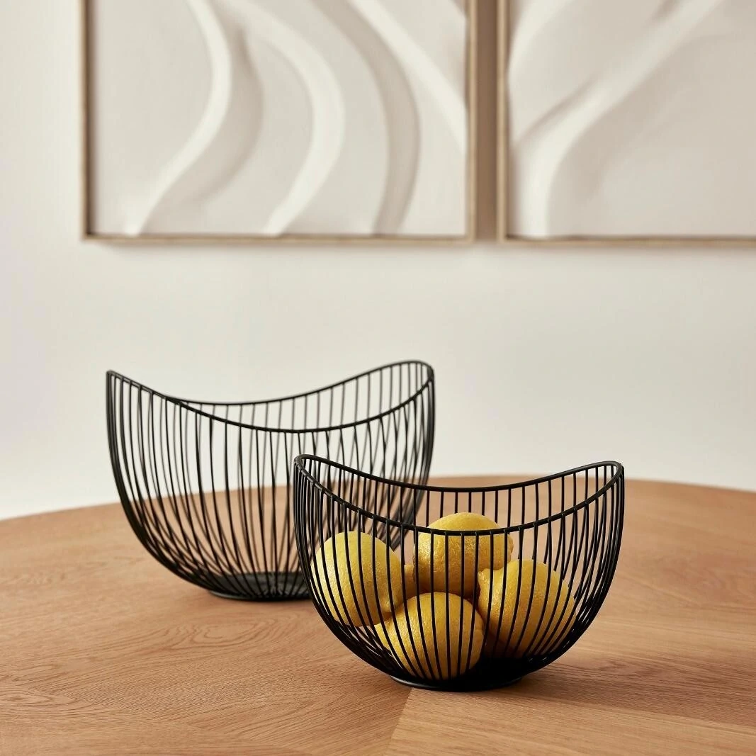 Centro de mesa decorativo em metal aramado preto, com design moderno e elegante. Disponível em dois tamanhos, é uma peça versátil que pode ser usada tanto sozinha quanto em composição, valorizando a decoração com estilo contemporâneo.