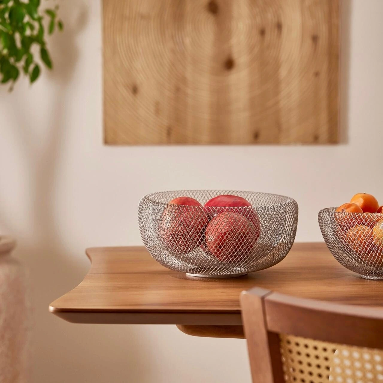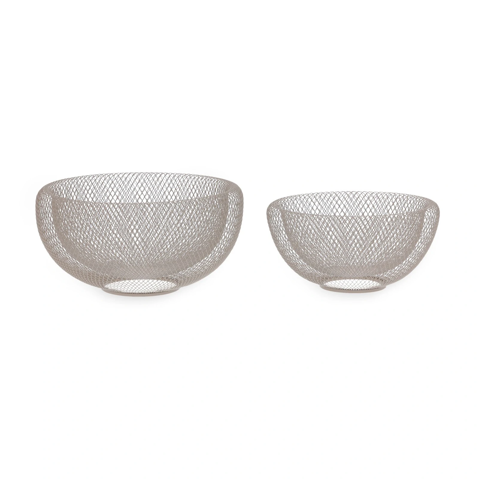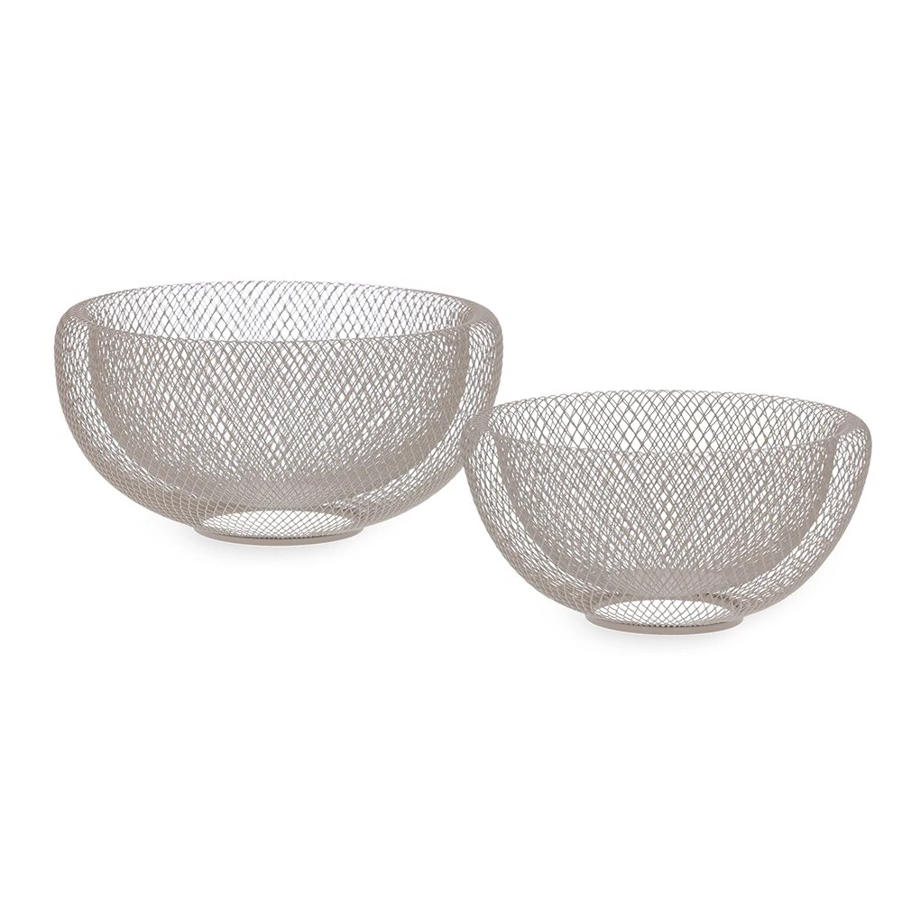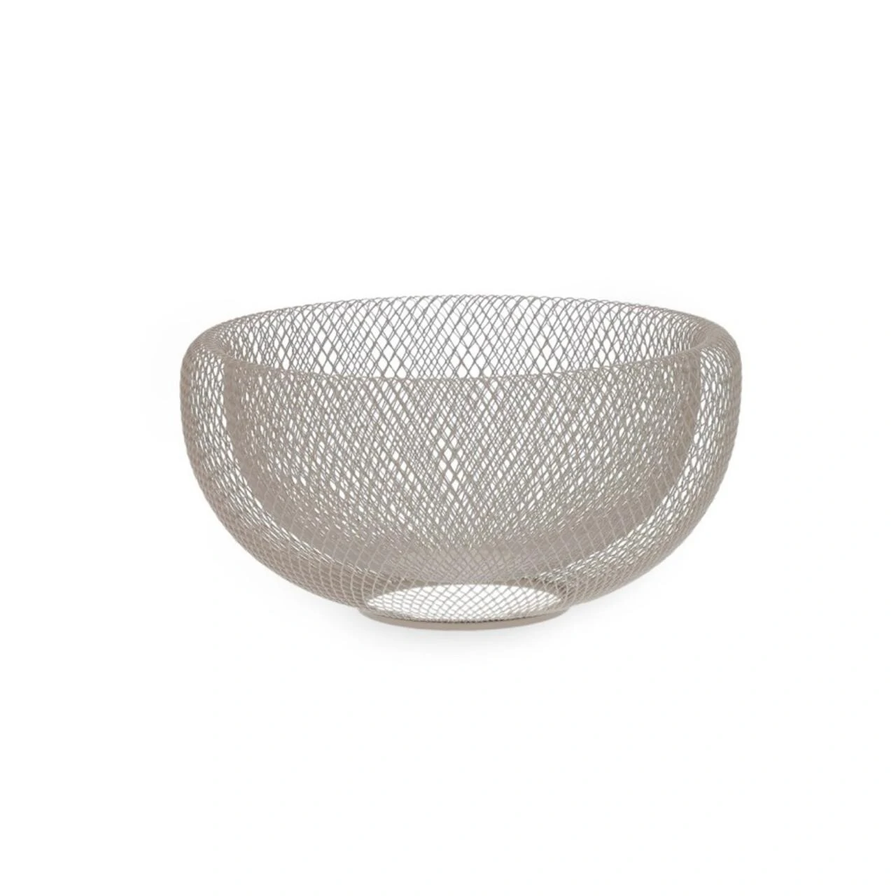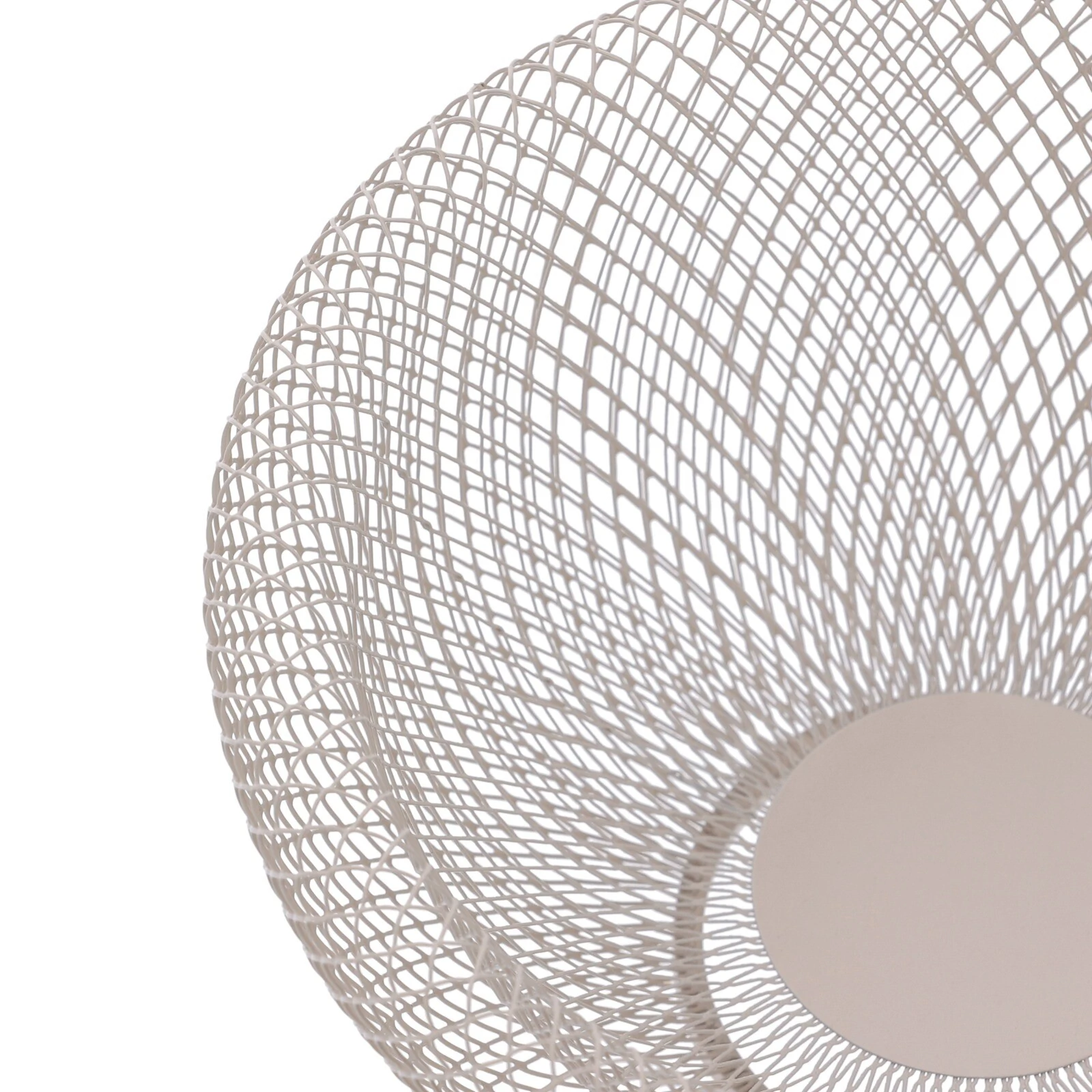 Centro de mesa aramado em metal, na cor bege com acabamento fosco. Versátil e elegante, pode ser usado tanto como peça decorativa quanto como fruteira, trazendo leveza e estilo à composição da mesa ou aparador.