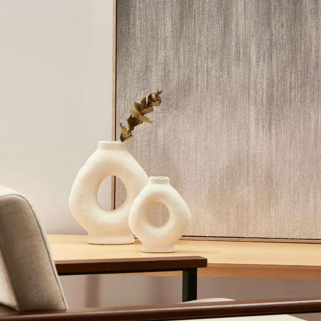 Vaso decorativo em cerâmica off-white, com design arredondado e vazado no centro. Possui o corpo mais largo no meio do que na base e na boca, criando um formato escultural que valoriza o ambiente mesmo sem flores. Uma peça que une arte e funcionalidade, destacando-se pela sua presença sofisticada.