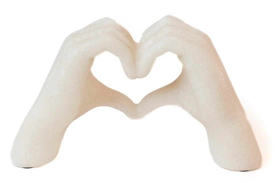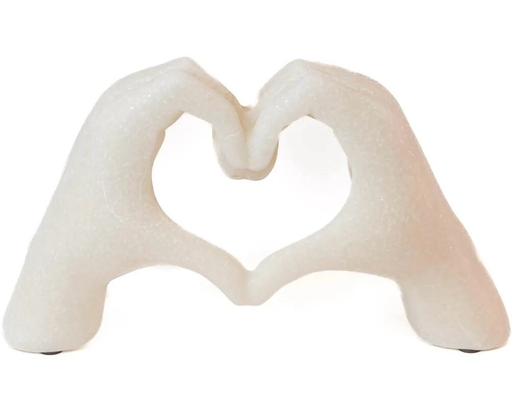 Escultura em mármore branco representando duas mãos formando um coração. Uma peça simbólica e cheia de significado, que transmite afeto, união e delicadeza através da força e da nobreza do mármore. Ideal para composições sensíveis e elegantes.