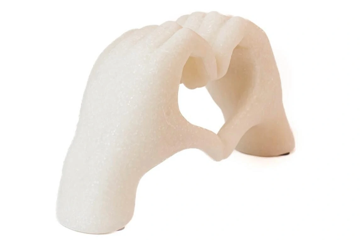 Design: Figurativo e expressivo, com formato de mãos moldadas em gesto de coração