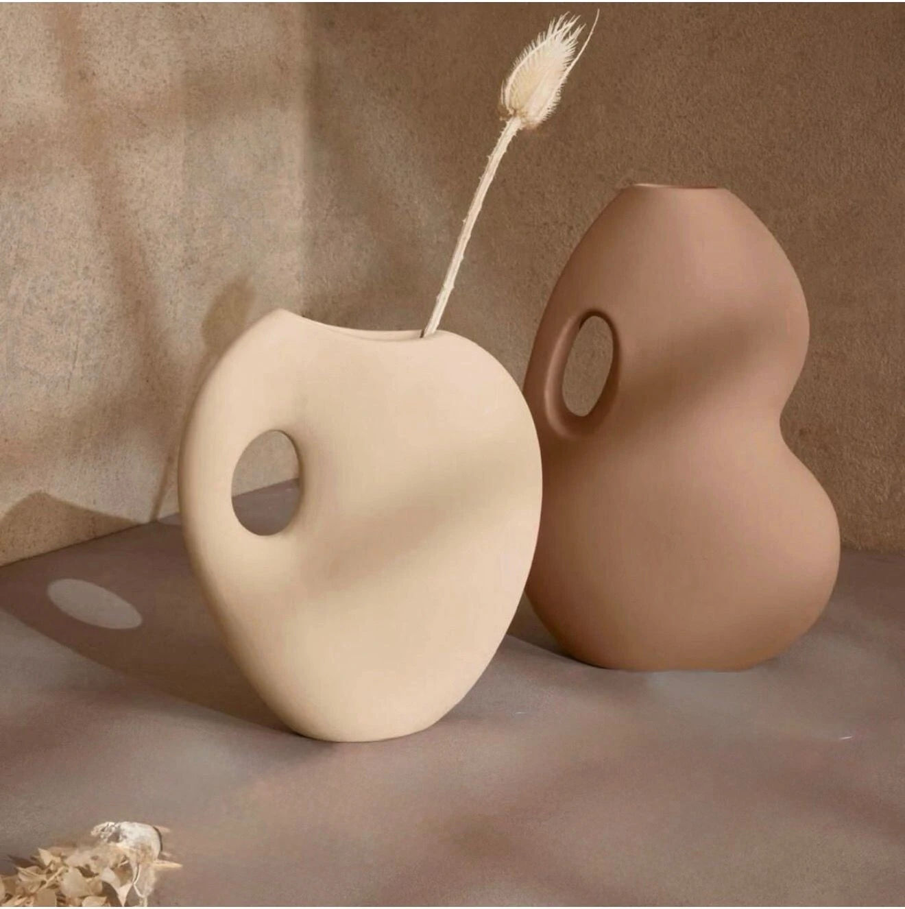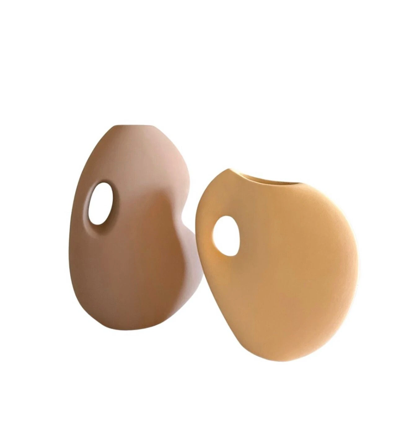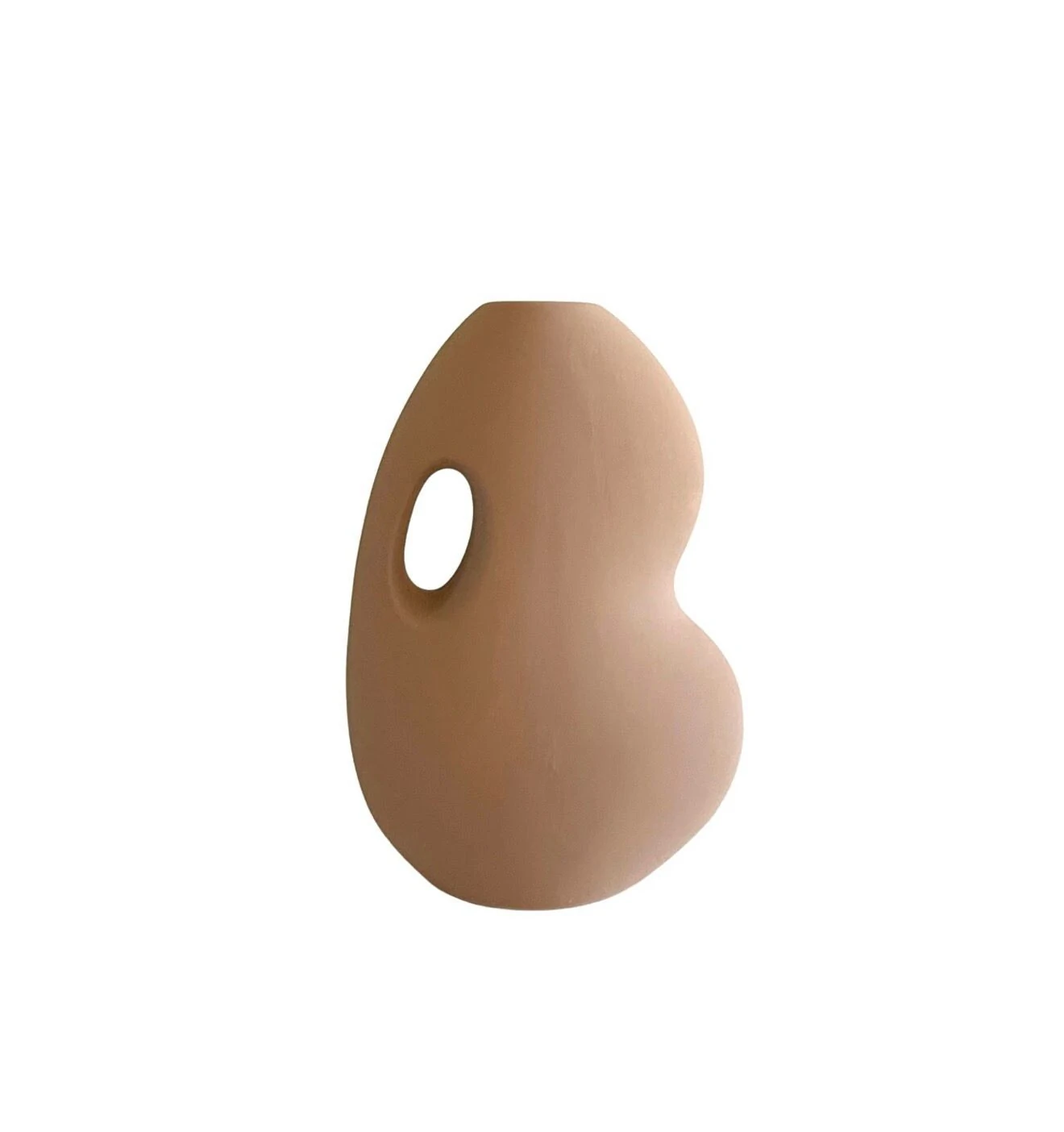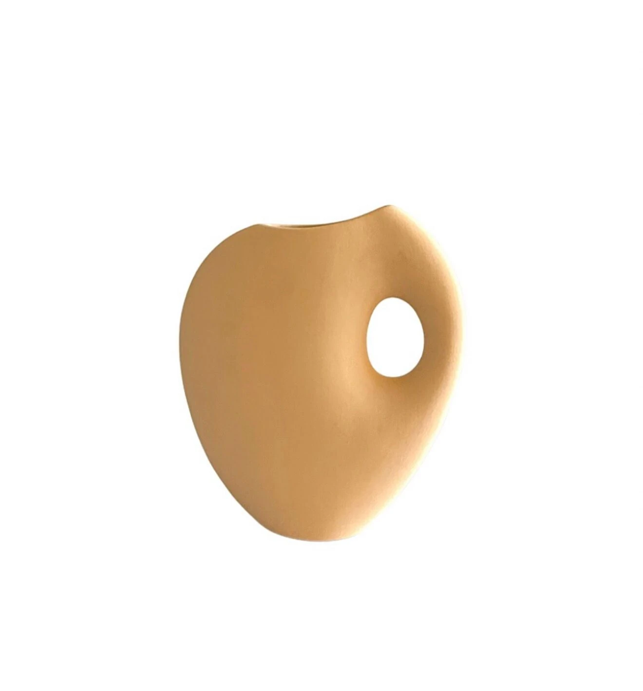 Vaso decorativo em cerâmica no estilo contemporâneo, com formato orgânico e detalhe vazado que remete a uma alça, ideal para encaixar a mão. Uma peça moderna e versátil, que adiciona personalidade e sofisticação à decoração. Disponível em dois modelos, ambos com design clean e acabamento elegante.