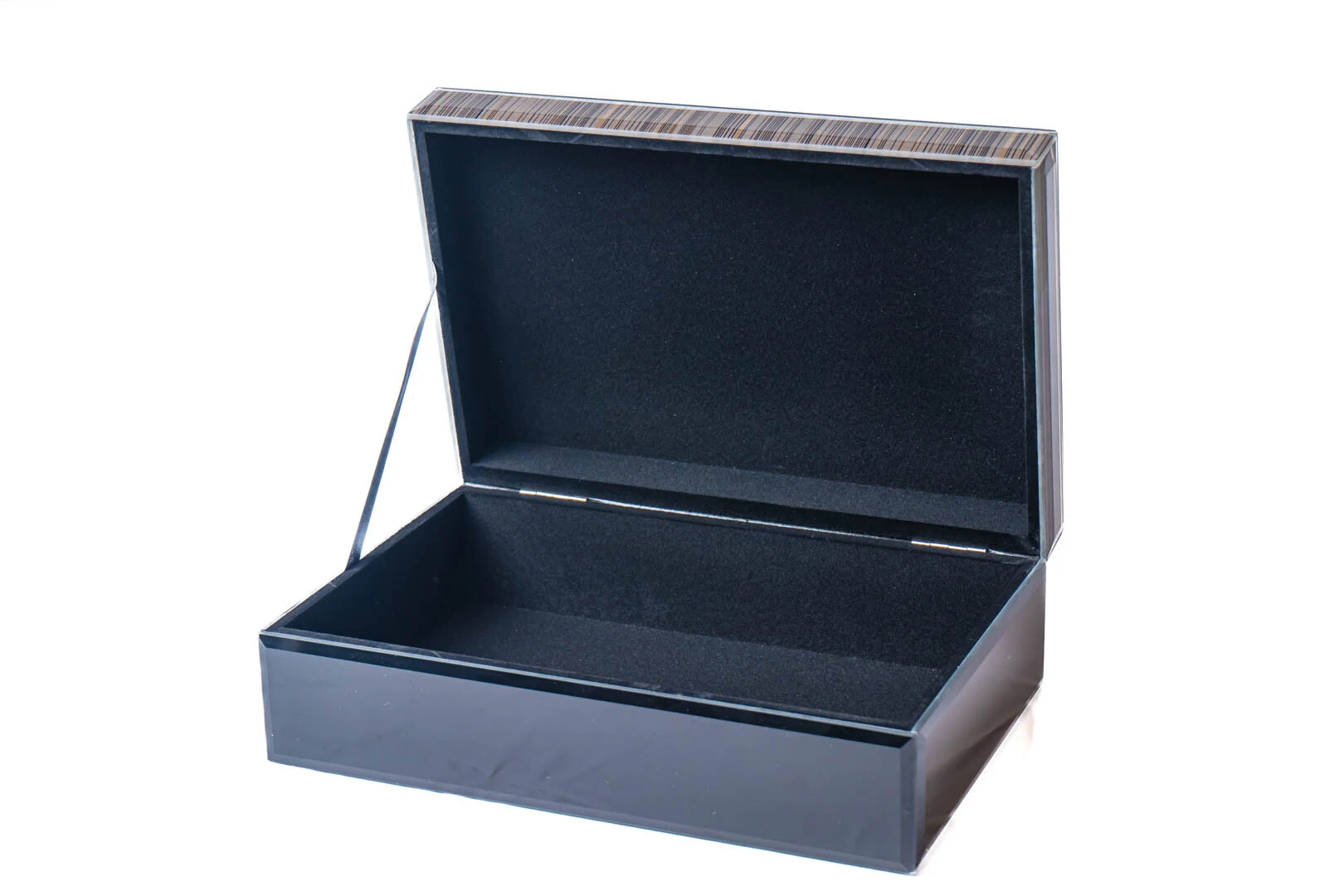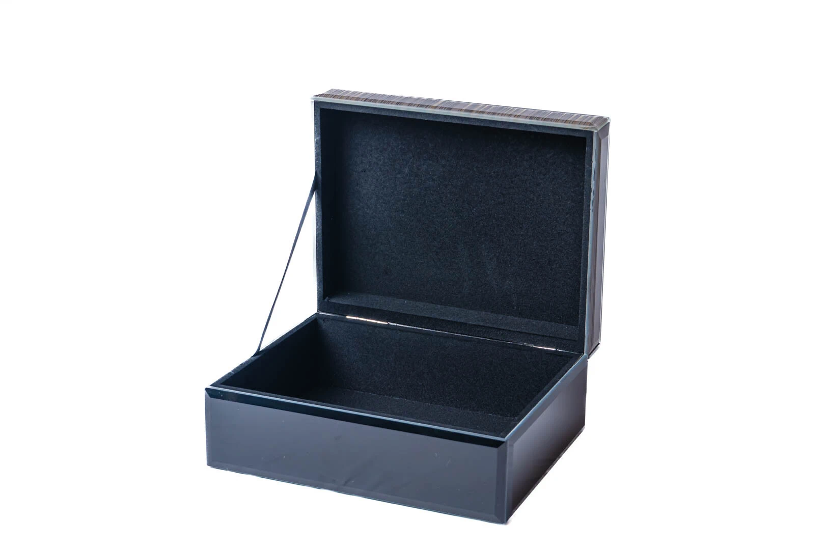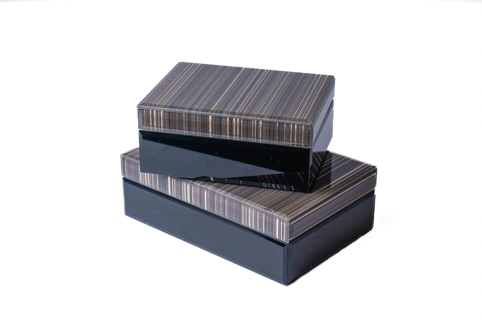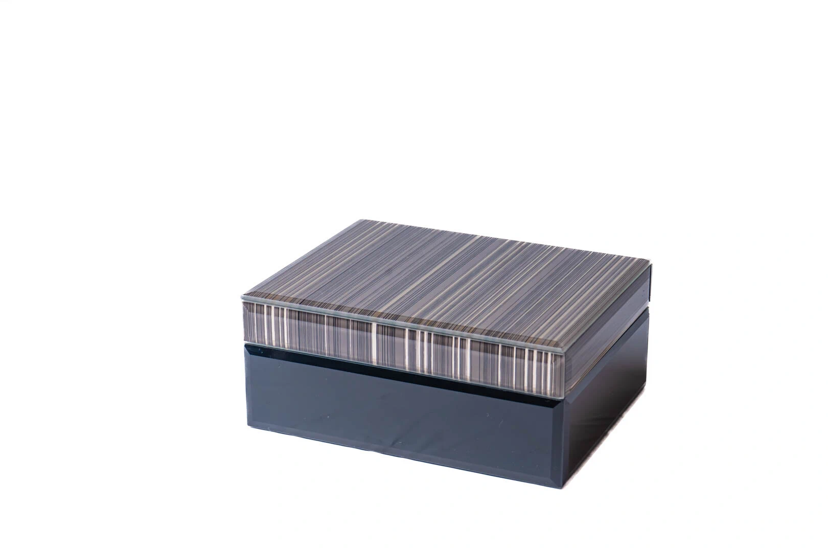 Caixa decorativa em vidro e madeira que une funcionalidade e elegância em cada detalhe. Com base na cor preta e tampa em listrado sofisticado nas cores preta, bege e dourada, essa peça é ideal para complementar a decoração com um toque de modernidade e charme. Disponível em dois tamanhos.