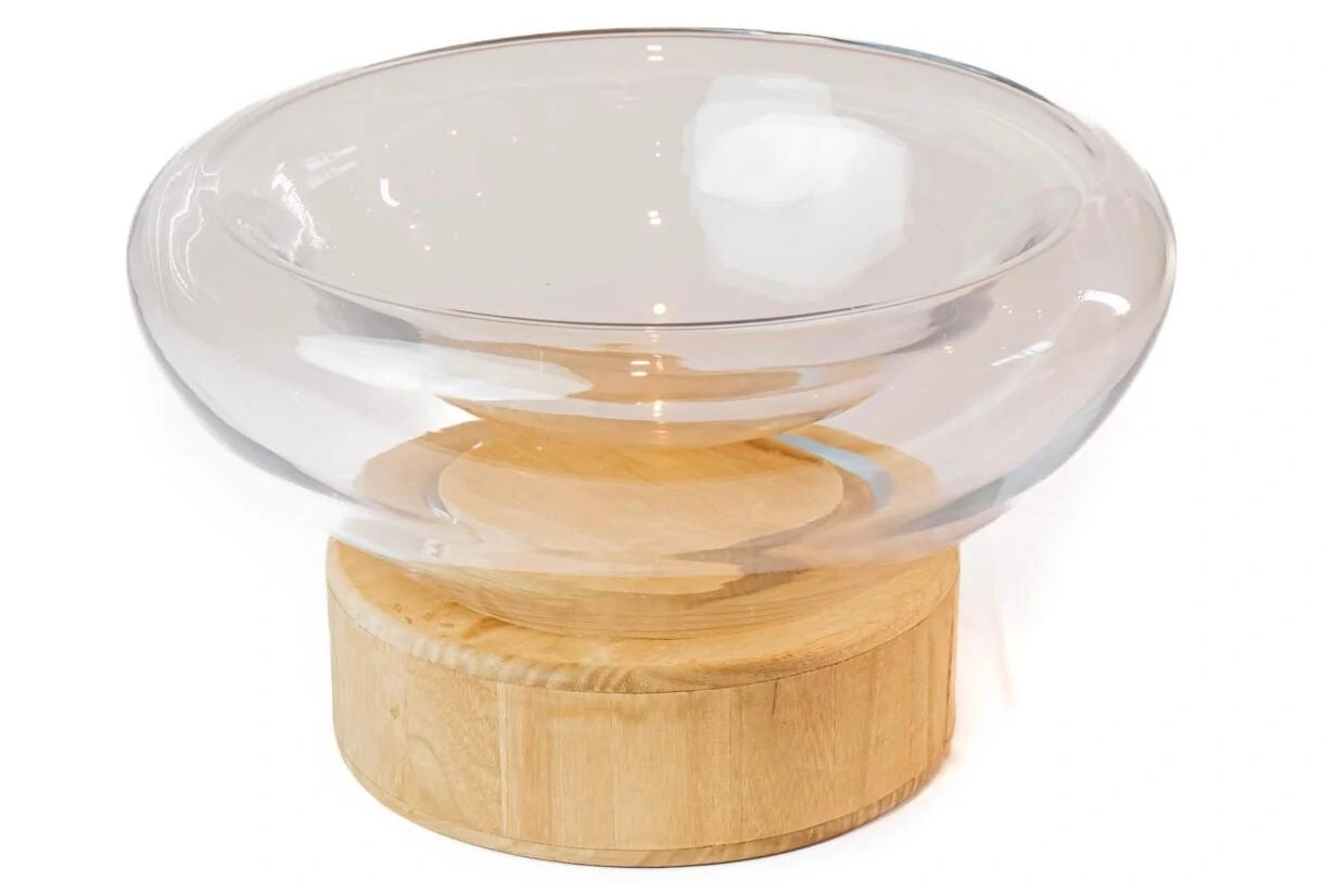Centro de mesa que combina a leveza do vidro com a rusticidade elegante da base em madeira. Uma peça versátil e sofisticada que adiciona charme e naturalidade à decoração, valorizando ambientes contemporâneos ou clássicos.