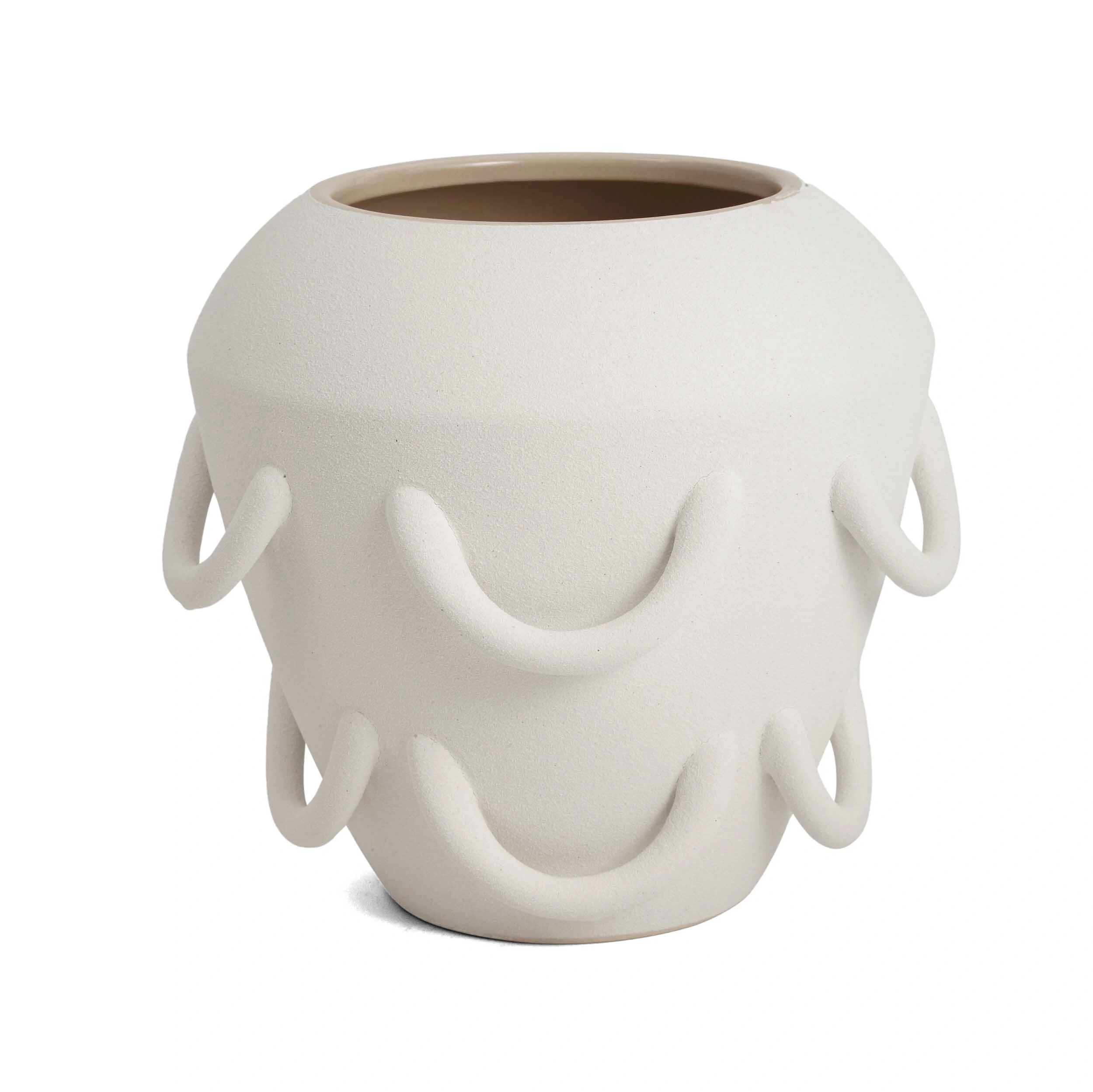 Vaso decorativo em cerâmica com acabamento branco e detalhes charmosos ao redor que remetem a pequenas alças, adicionando personalidade e textura à peça. Uma escolha perfeita para quem busca um toque de elegância e originalidade na decoração.